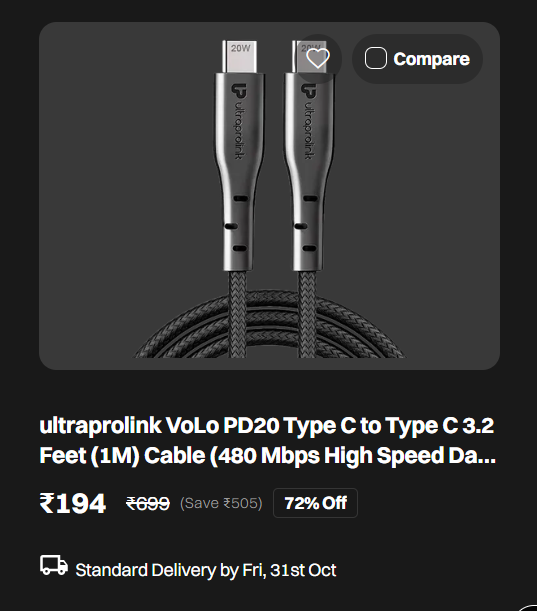 Get the Ultraprolink VoLo PD20 USB-C to USB-C Cable (1M) at a massive 72% discount! This high-speed cable supports 480 Mbps data transfer and is perfect for charging and syncing your devices.
