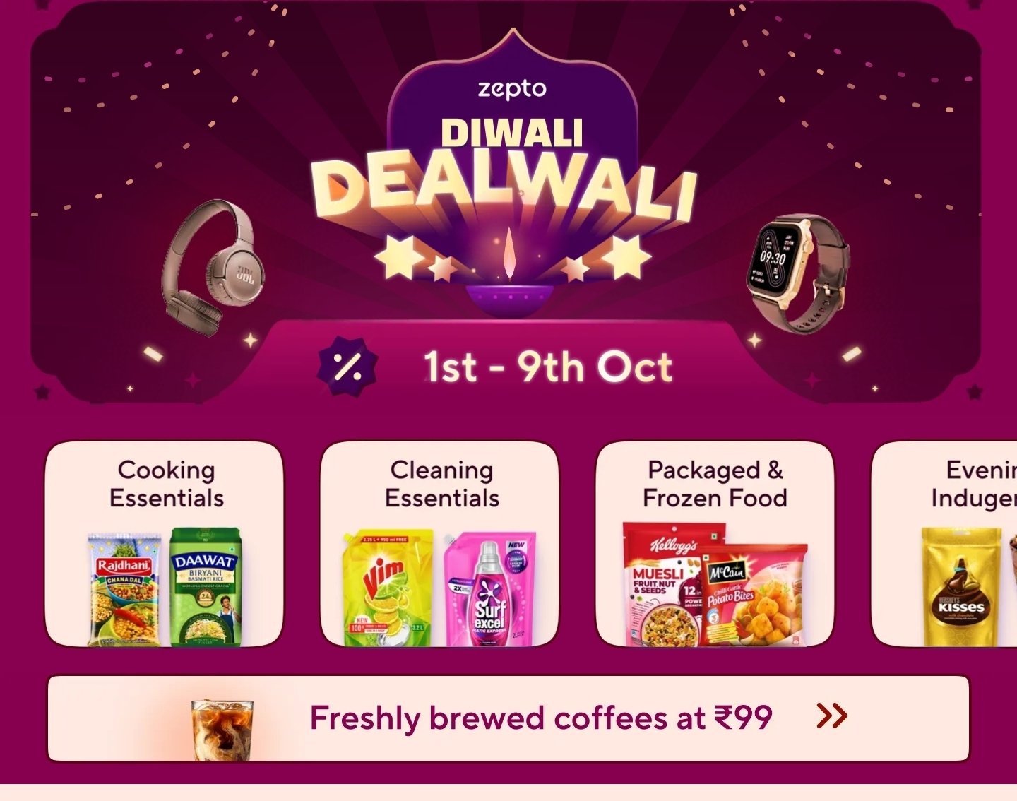Get ready for the Zepto Diwali Dealwali Sale, offering amazing discounts of 70-80% off on a wide range of groceries and daily essentials! Stock up and save big from October 1st to October 9th.