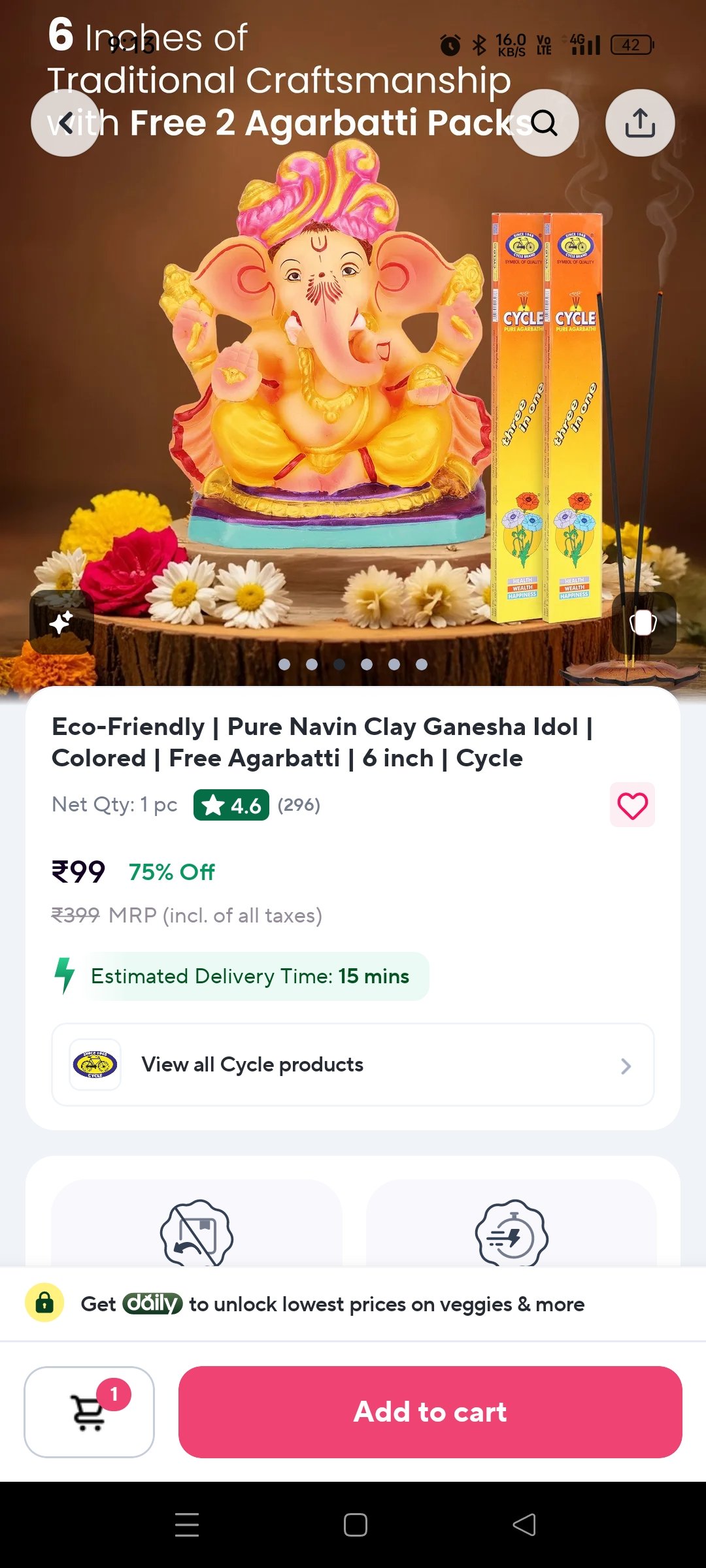 Get this beautifully colored 6-inch idol, perfect for your festivities, along with a Free Cycle Agarbatti.