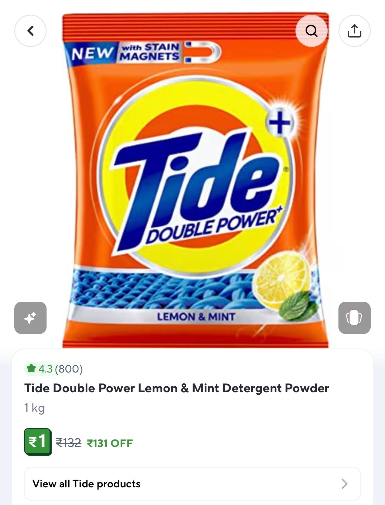 Loot Deal Alert! Get the Tide Double Power Lemon & Mint Detergent Powder 1kg for an incredible ₹1 on Zepto!