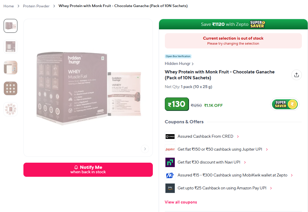 Grab an incredible 90% discount on Whey Protein with Monk Fruit, Chocolate Ganache flavor (Pack of 10 Sachets) at Zepto!