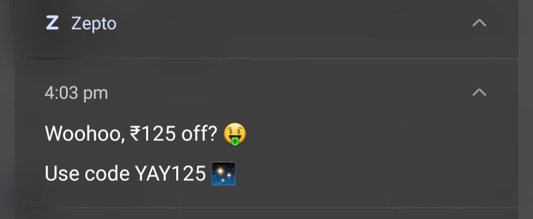 Grab an exclusive flat ₹125 discount on your Zepto orders! This offer is account-specific and was received via notification. Apply the coupon code YAY125 at checkout to avail the savings.