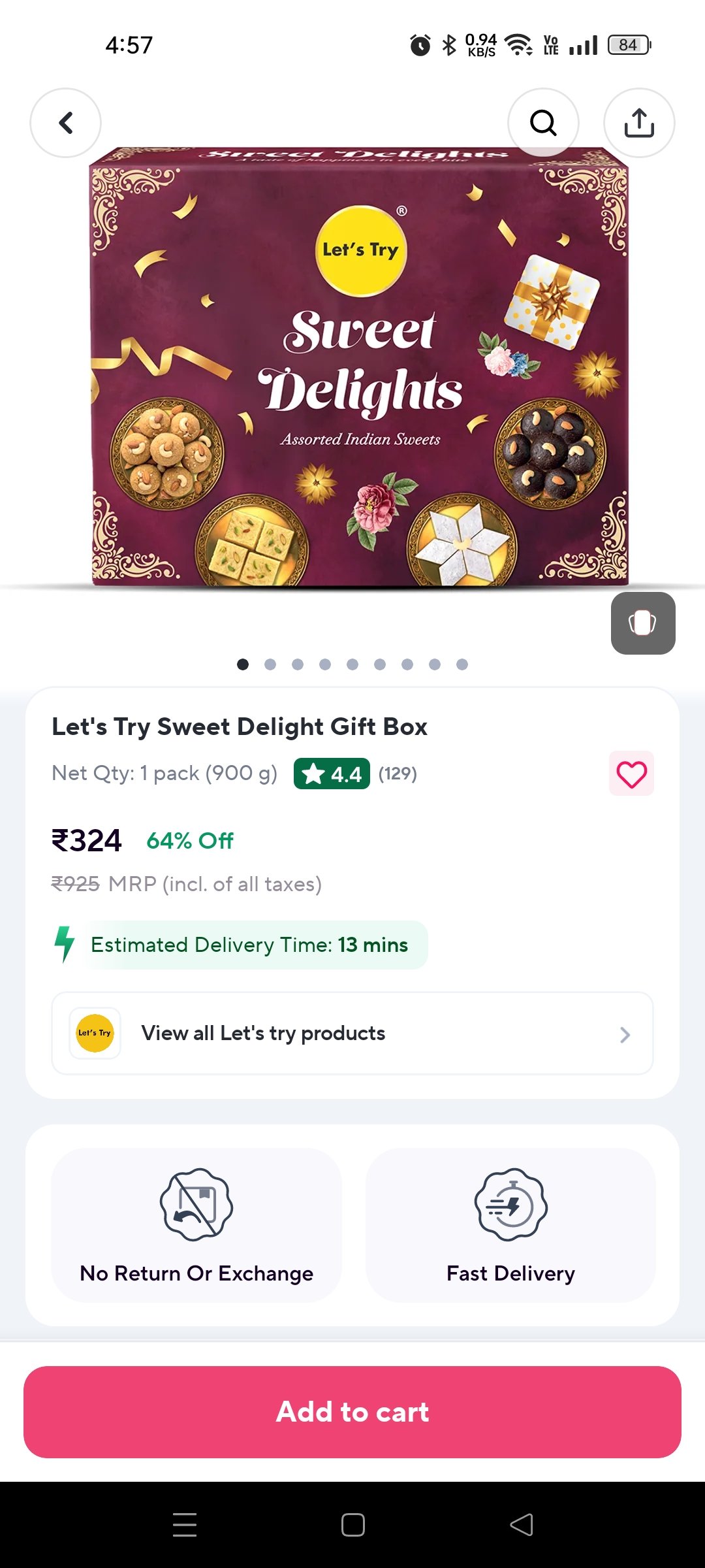 Get the Let’s Try Sweet Delight Gift Box (900g) from Zepto at a fantastic 65% discount! This offer is location-specific, valid for pincode 625009.
