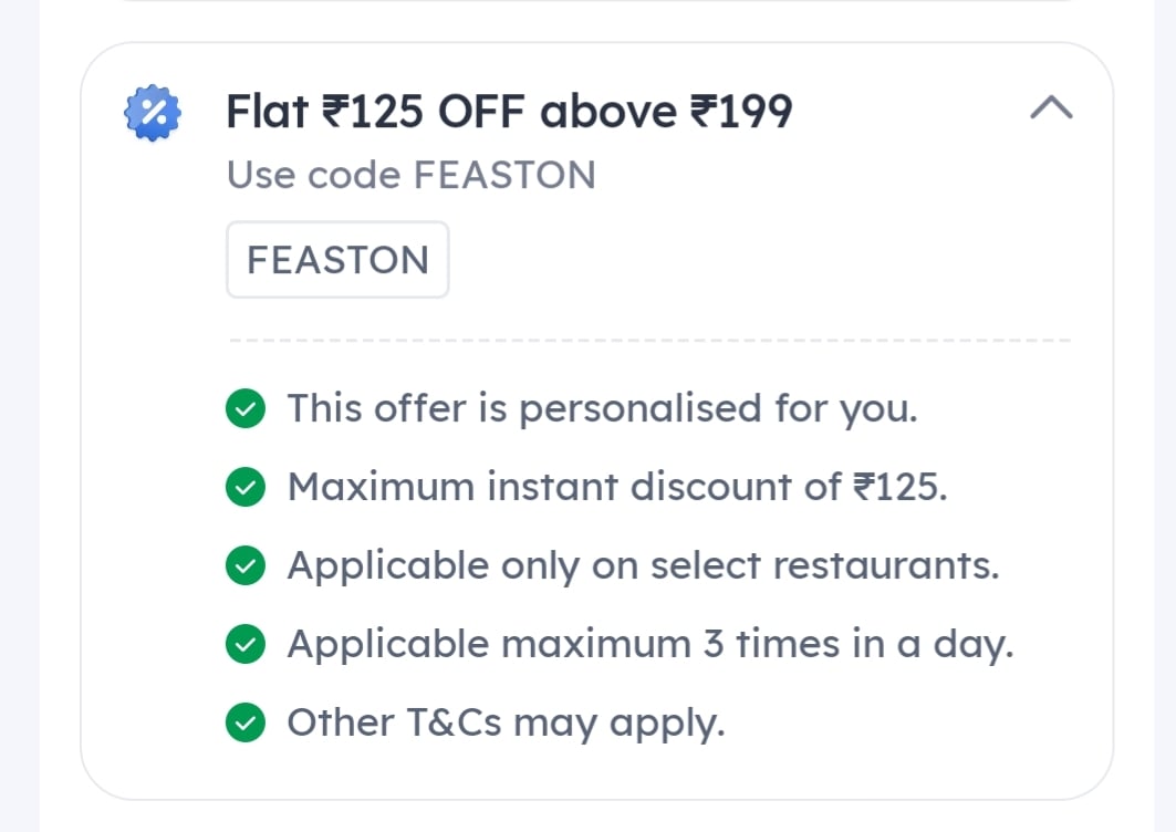 Get a flat ₹125 discount on your Zomato food orders totaling ₹199 or more. This offer is ideal for enjoying your favorite meals at a reduced price.