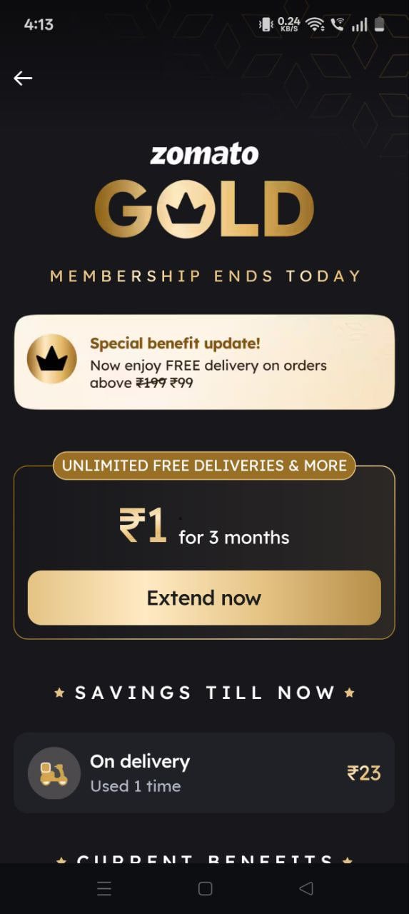 Get an exclusive extension for your Zomato Gold membership! Eligible users can extend their Zomato Gold subscription for 3 months at just ₹1. This is an account-specific offer, so check your Zomato app’s Gold section for eligibility.